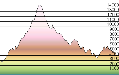 Each trail description includes a cross section or profile of the trail. Each profile is color coded for elevation with 1000 feet intervals marked by black lines. In a concession to the low bandwidth of the internet annotation on each individual profile had to be minimized, however, a link to this page was provided to each trail site to help compensate for this limitation. The vertical exaggeration is just over 3.5 |